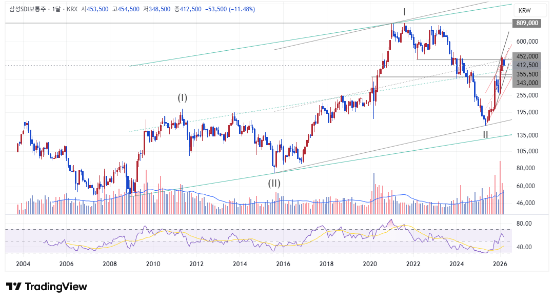 삼D가 순조로운 항해를 이어간다면 슈퍼사이클 규모의 (Ⅲ)파 구간에 돌입했으며, 현재 그 하위 파동 Ⅰ을 마치고 조정, 반등 중이다.