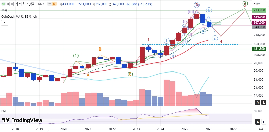 엘리어트 파동 절대 법칙상 4파가 1파 고점을 하향 돌파하면 안 되므로, 이 카운팅이 맞다면 위 그림에서 진분홍색으로 표기된 1파의 고점 158,200원이 최종 지지선이 된다.