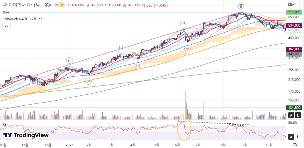연보라색으로 표기된 파동 중 3파를 지나 급락하면서 투매 거래량이 나왔고 RSI도 급격히 꺾이며 이후 다이버전스 흐름을 보이다가 주가 고점을 찍었다.
