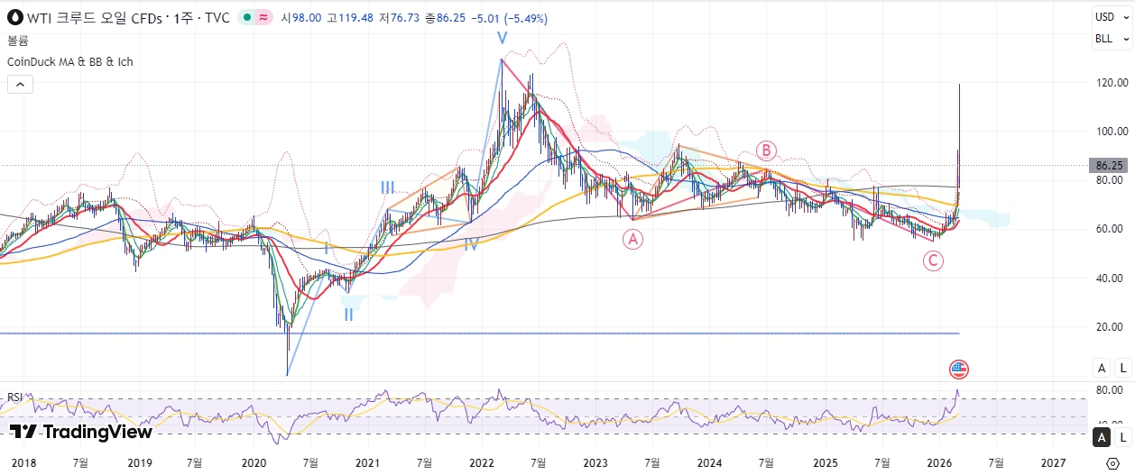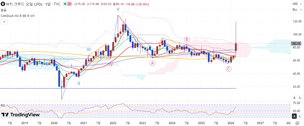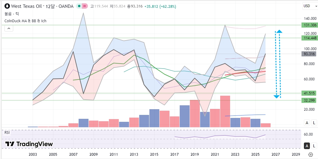WTI 차트는 2025년 12월까지 하락을 완료하고 슬금슬금 상승을 준비하고 있었다.